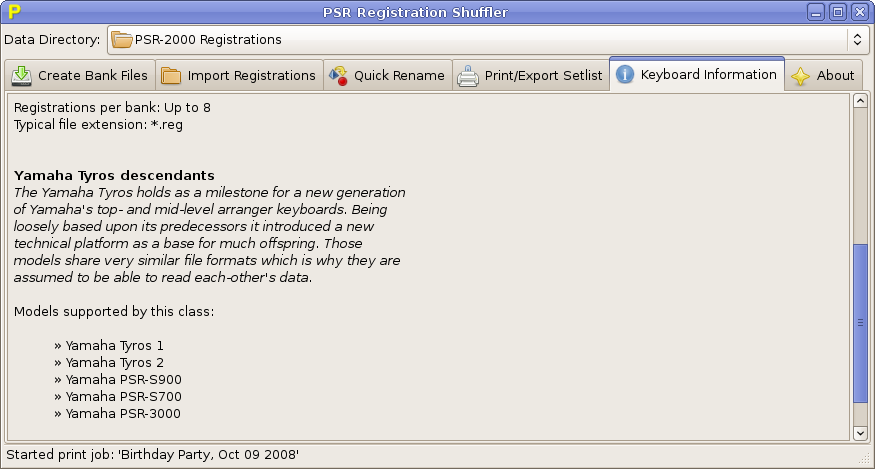 | Keyboard informationDuring startup the program looks for which keyboard models it finds supporting classes. Those are queried for their capabilities as well as a long description of their range of instruments. This information can be looked at on a dedicated tab called »Keyboard Information«. So you always know what your copy of the program is able to do.