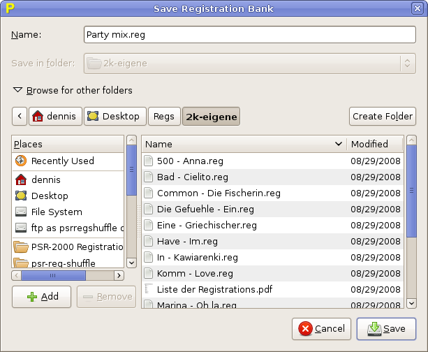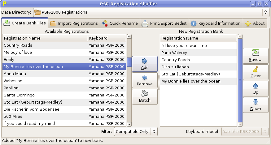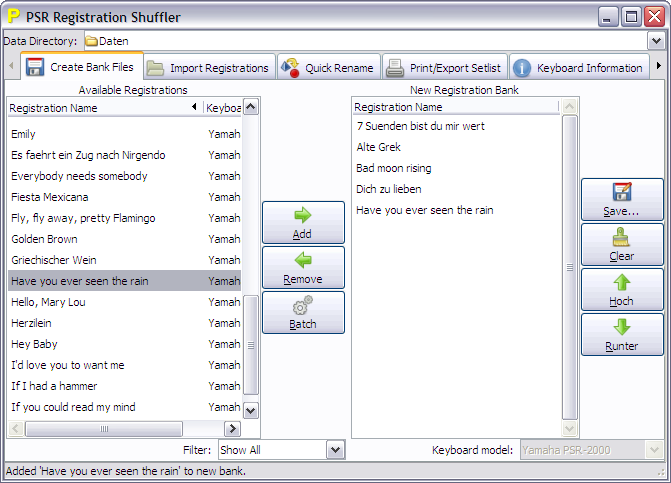 | Creating new bank filesOnce you got your archive straight creating new bank files is as easy as dragging songs from the left list to the right. In order to remove songs from the right list simply drag them back. Or you can or use the dedicated buttons at the right-hand side. Unecessary to mention that you can rename both: Available registrations as well as exported song names. If you change the song name in the right (export) list the original registration remains untouched. You just change the name within the newly created bank file.