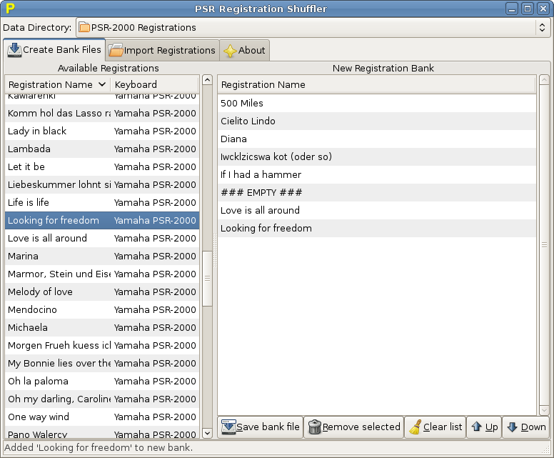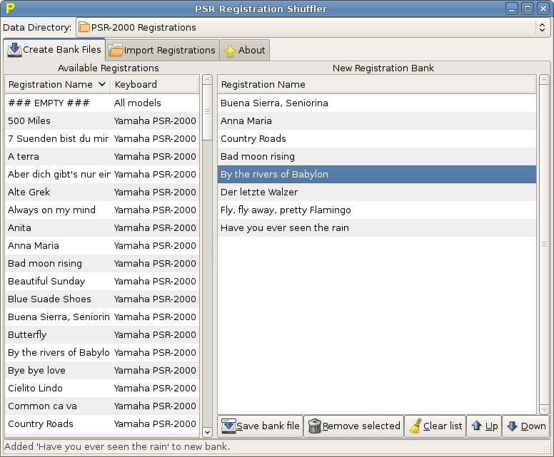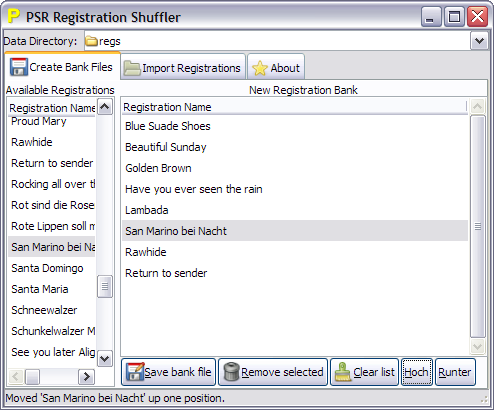 Creating new bank filesOnce you got your archive straight creating new bank files is as easy as dragging songs from the left list to the right. In order to remove songs from the right list simply drag them back or use the buttons below. Unecessary to mention that you can rename both: Available registrations as well as exported song names. If you change the song name in the right (export) list the original registration remains untouched. You just change the name within the newly created bank file.