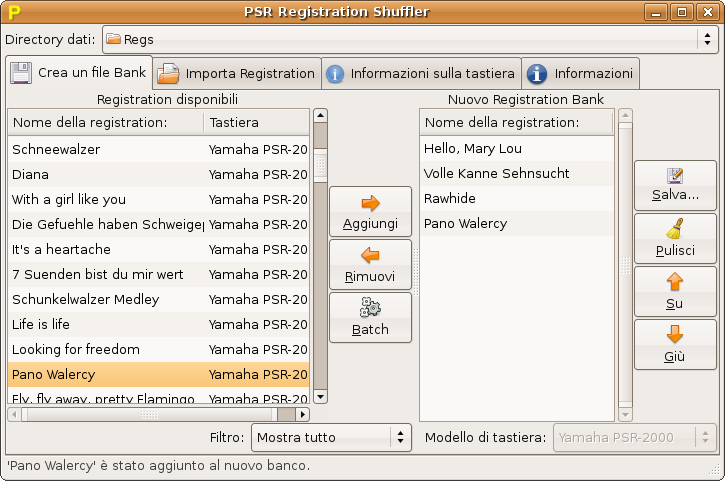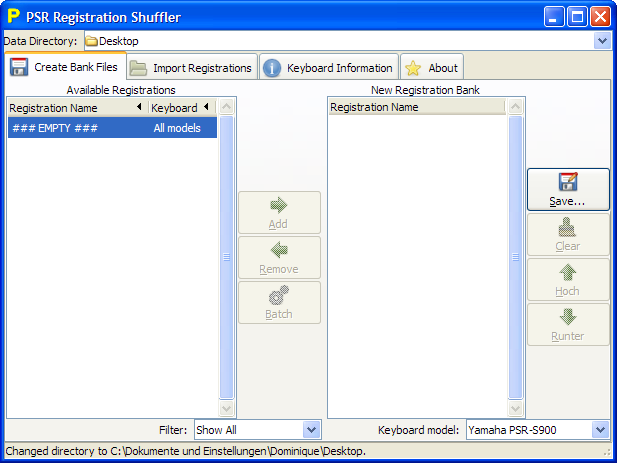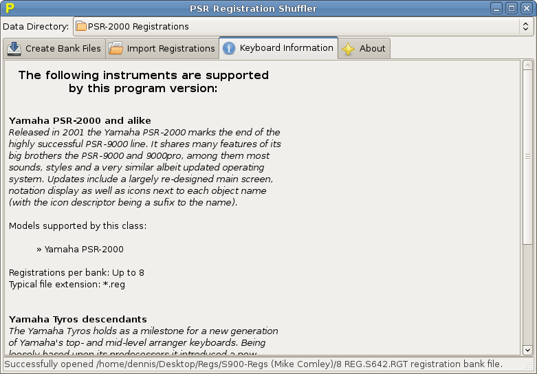 Batch CreationNot only does version 0.2 bring support for five keyboard models it comes with a new, very useful feature, too: Batch creation. This makes organizing your registrations a breeze. Choose what order you want and the program will create all needed bank files ready to use on your instrument all alone. You can choose between:
